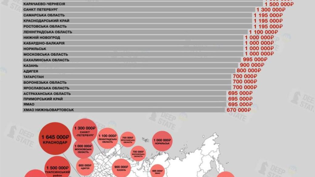 В россии единовременные выплаты военным российской армии за заключение контракта на участие в войне против Украины достигли суммы в почти 20 000 долларов. Об этом сообщается по данным инфографики DeepState.