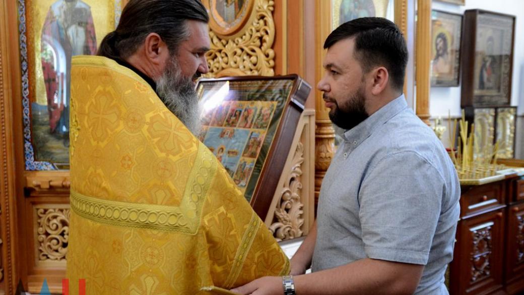 Главарь «ДНР» Денис Пушилин сегодня посетил богослужение в честь 1031-летия Крещения Руси в Свято-Владимирском храме Куйбышевского района неподконтрольного Украине Донецка.