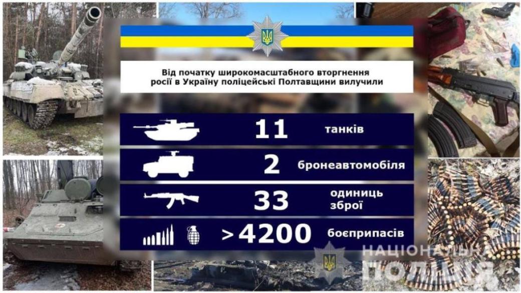 Также, как сообщают правоохранители, за 5 месяцев изъято у жителей Полтавщины 11 танков, 2 бронированные машины и 4 ручных гранатомета и более 4 тысяч боеприпасов.