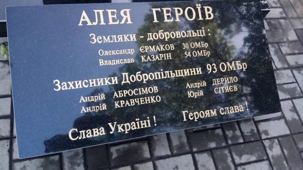 На новом памятнике написаны имена военных, погибших на территории Добропольского района за время АТО и добровольцев из Донетчины — Влада Казарина и Александра Ермакова.