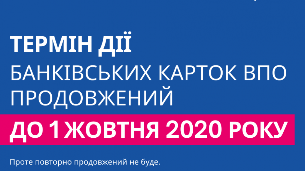 Срок действия банковских карт ВПЛ, истекший во время карантина, продлен до 1 октября 2020 года, однако повторно продлен не будет. Об этом сообщает БФ «Право на захист».