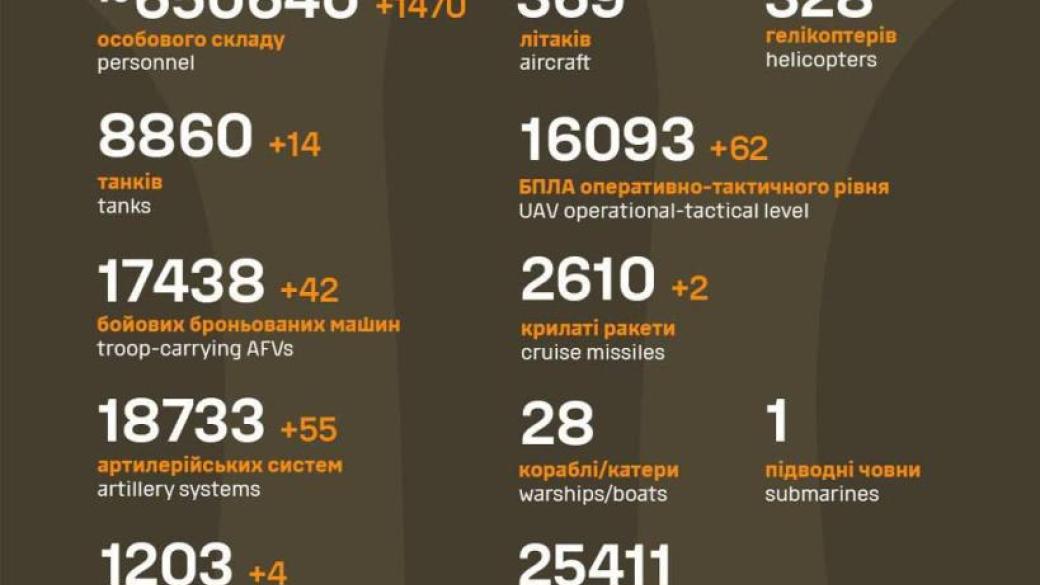 ВСУ за минувшие сутки уничтожили 1 470 оккупантов и более 270 единиц вражеской техники