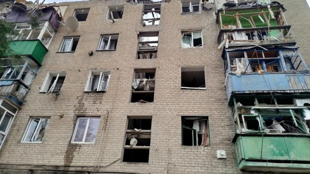 В результате прямого попадания в многоэтажный дом полностью обрушился один из подъездов. Жители оказались заблокированы в квартирах, разрушенная лестничная клетка.