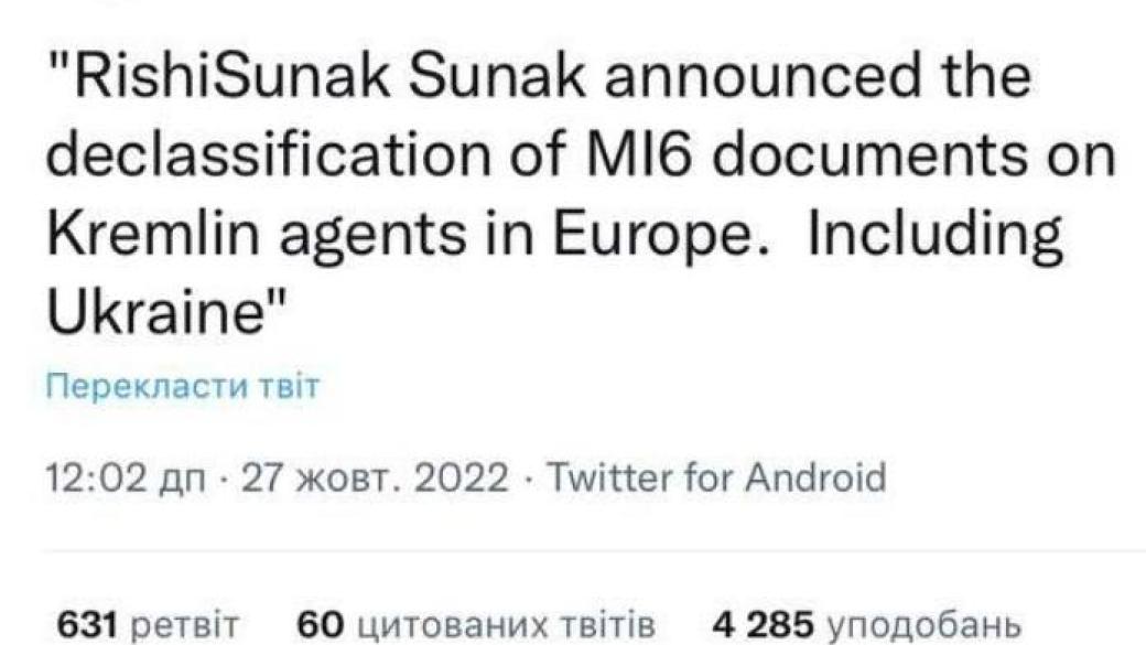 Новый британский премьер Риши Сунак обещает рассекретить документы разведывательной службы Mi6 относительно российской агентуры в Европе, также включая тех агентов, которые работали по Украине.