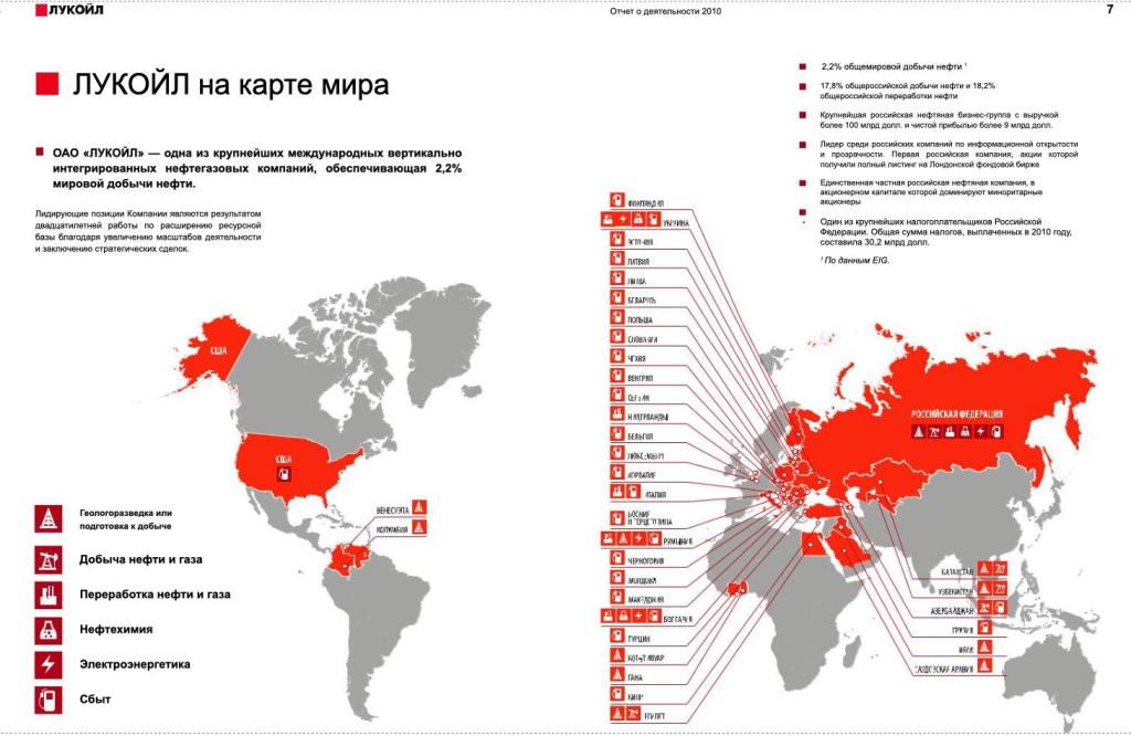 "Лукойл" владеет трейдером со штаб-квартирой в Женеве, НПЗ в Румынии и Болгарии, долей в НПЗ в Нидерландах, сетью из почти 2,5 тысячи автозаправок в различных странах, в том числе в Евросоюзе, Грузии, балканских странах и в США. Также компании принадлежит предприятие в Ираке, управляющее разведкой и добычей газа.