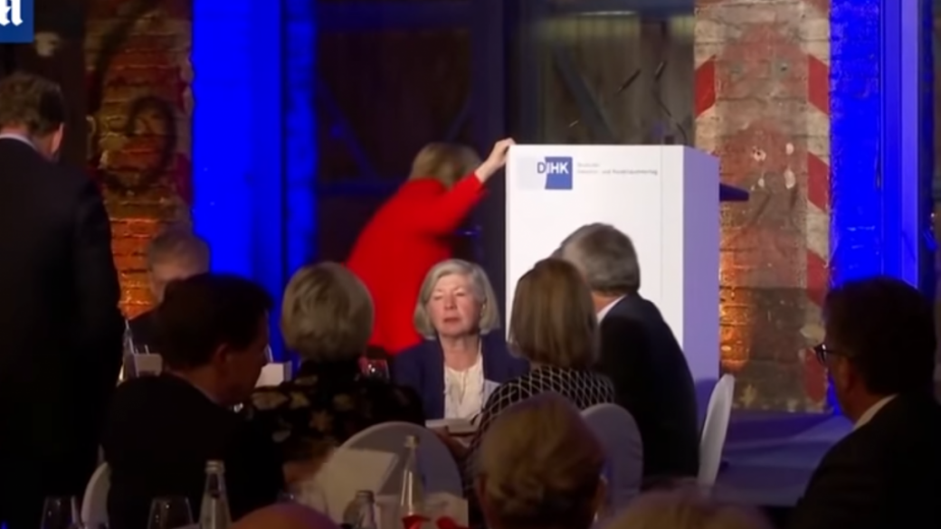 Канцлер Германии Ангела Меркель, поднимаясь на трибуну, чтобы выступить перед представителями торговли и промышленности в Берлине споткнулась и упала. Об этом сообщает таблоид Daily Mail.