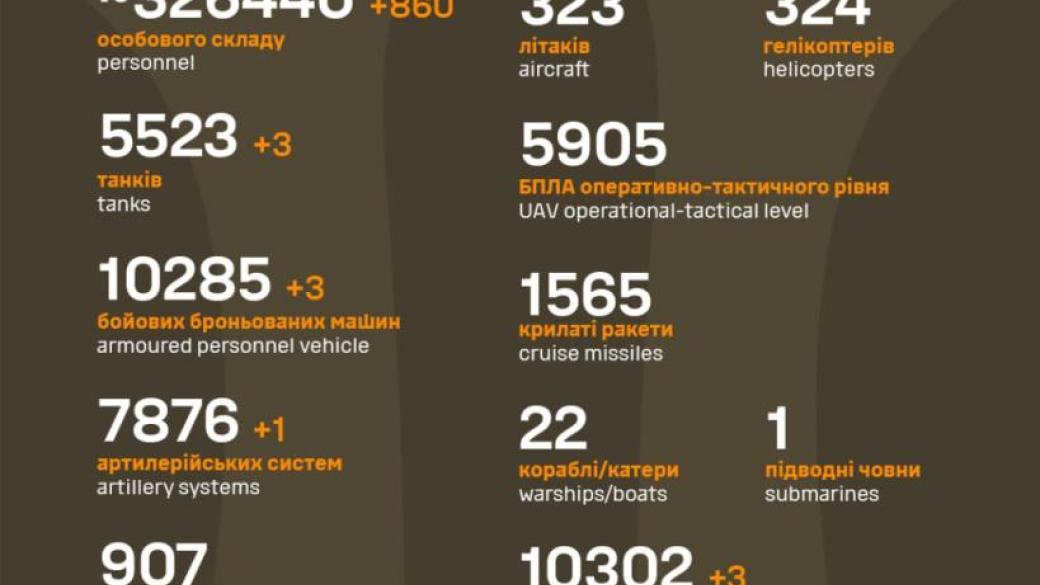 - личного состава - около 326 440 (+860) человек ликвидировано;