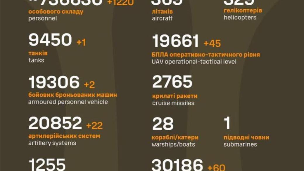 За минувшие сутки Силы обороны уничтожили 1220 оккупантов и более 100 единиц вражеской техники.