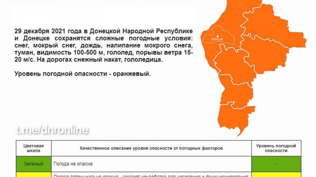На неподконтрольной Украине территории Донетчины 29 декабря сохранятся сложные погодные условия: снег, мокрый снег, дождь, налипание мокрого снега, туман, видимость 100−500 м, гололед, порывы ветра 15−20 м/с. При этом на дорогах прогнозируется снежный накат, гололедица. Об этом сообщает так называемый «МЧС ДНР».