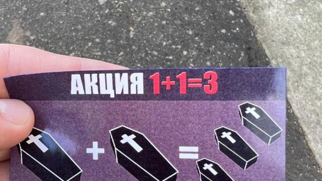 Поддельная визитка организации с ее настоящими номерам телефонов рассказывает об акции, по которой семьям военнослужащих предоставляются три гроба при заказе двух.