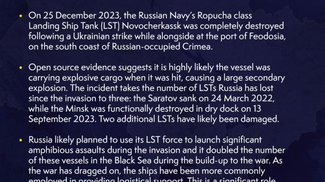В результате украинского удара 25 декабря в порту оккупированной Феодосии большой десантный корабль "Новочеркасск" ВМФ россии был полностью уничтожен. Об этом сообщает Министерство обороны Великобритании в Twitter.