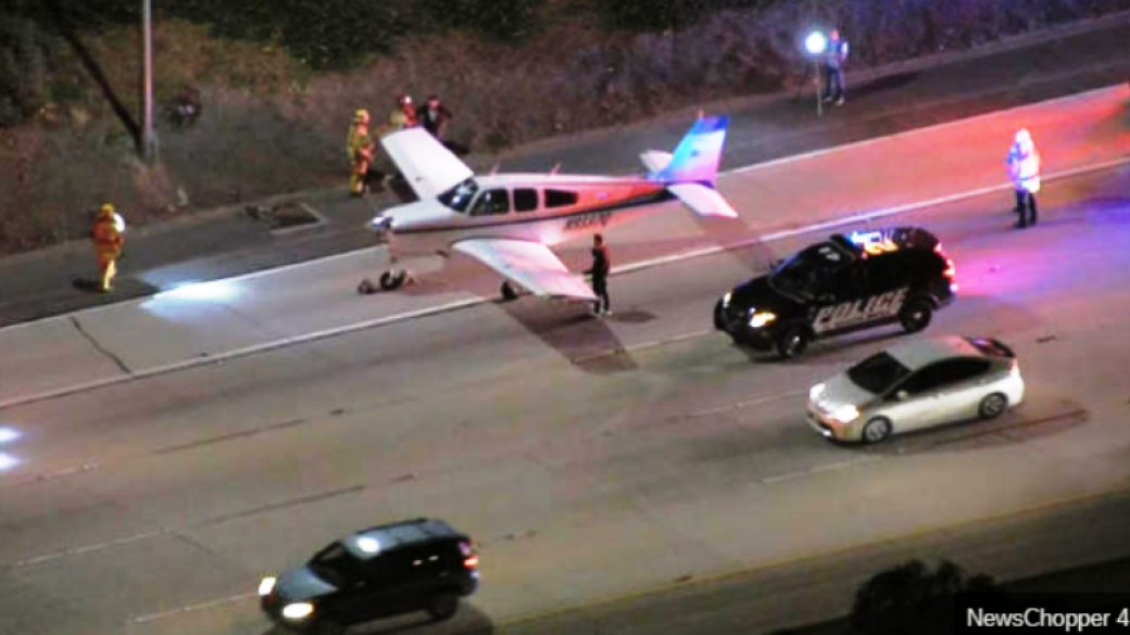 В США, возле Лос-Анджелеса, легкомоторный самолет Beech G33 совершил экстренную посадку на автомагистраль после того, как у него забарахлил двигатель.