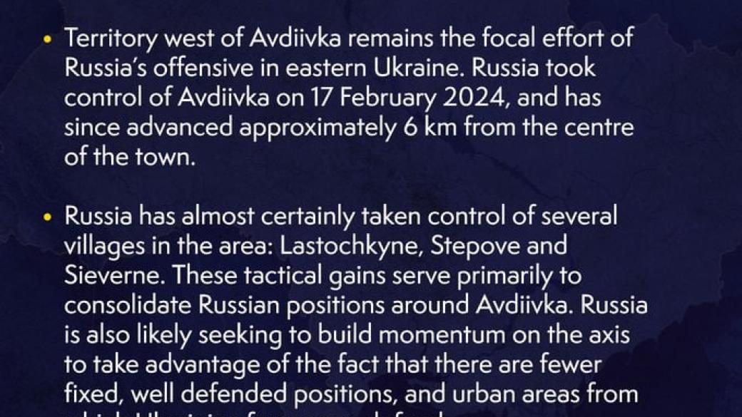 Российская армия после захвата Авдеевки Донецкой области продвинулась на 6 км. Об этом сообщает Минобороны Британии.