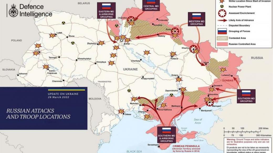 Министерство обороны Великобритании опубликовало карту захваченных российскими войсками территорий Украины и территорий, за которые сейчас ведутся бои по состоянию на 29 марта. Красным на ней обозначены территории, попавшие под контроль российской армии, а штриховкой — те, за которые идут бои.