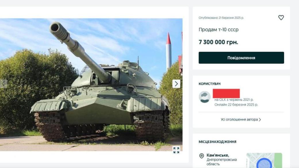 В ОЛХ пытаются продать советский танк Т-10 за 7,3 млн грн. Соответствующее объявление опубликовано на сервисе.