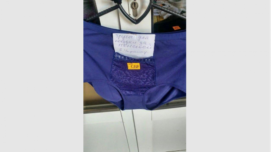 Известный блогер Адольф Донецкий (он же Фашик Донецкий) опубликовал на своей странице в соцсети фото торгового лотка, на котором в ассортименте присутсвуют «трусы для поездки за пенсий в Украину».