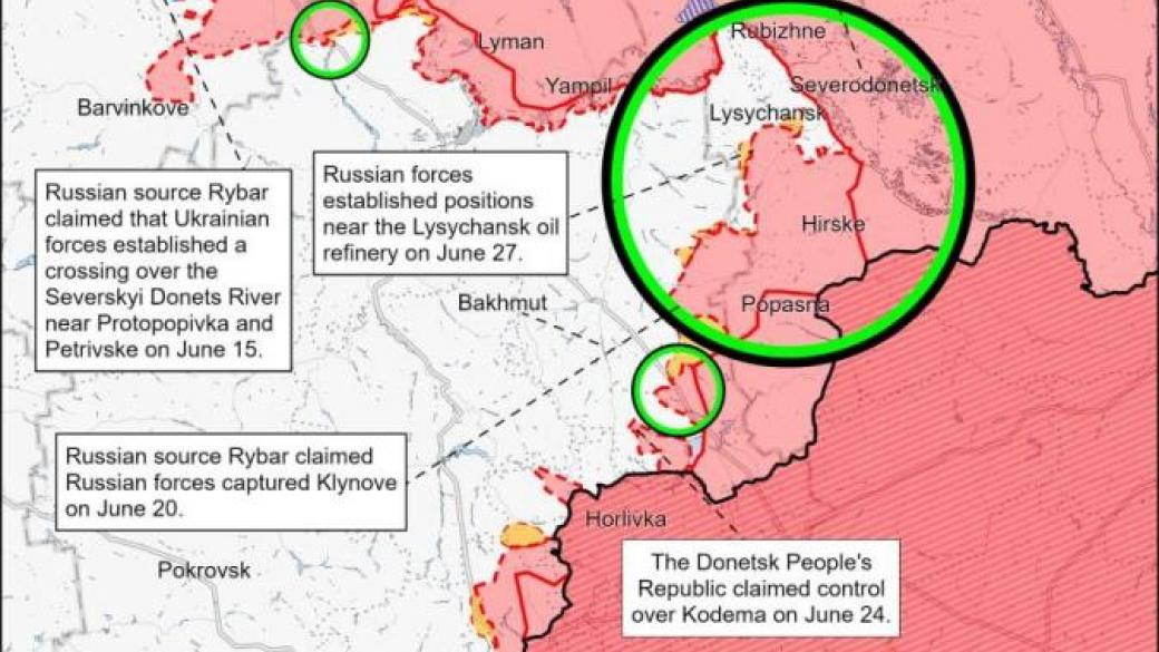 Российские войска продолжали штурм к югу и юго-западу от Лисичанска. Представители войск РФ заявляют, что украинские силы начали отход от города, но ISW не может подтвердить эти заявления.