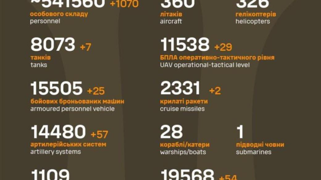 Оккупанты рф за прошедшие сутки потеряли 1070 человек личного состава, 57 артсистем, 29 БПЛА и другую технику.