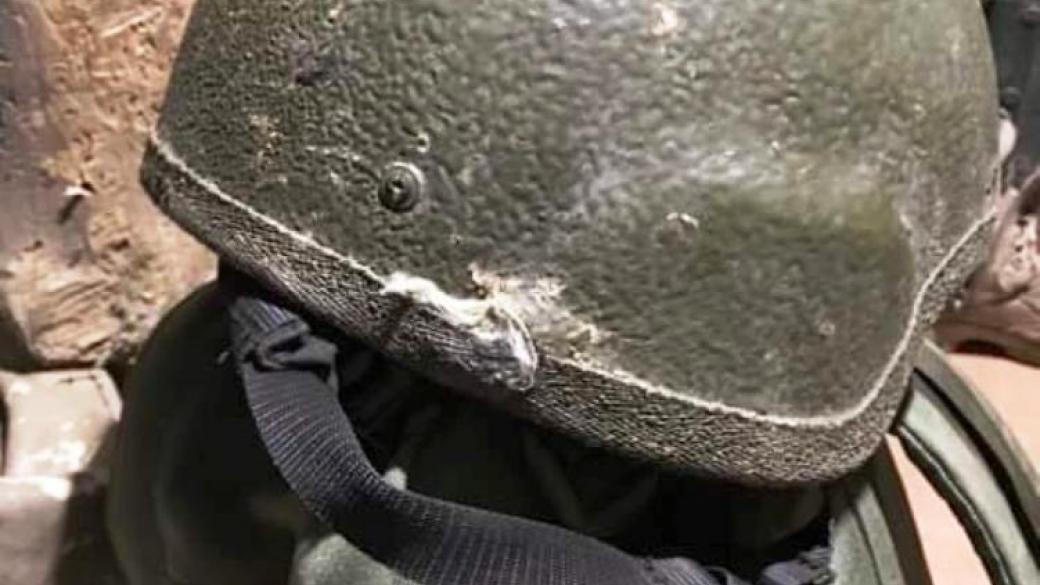 «Пуля прошла по касательной. Боец жив. Рука раздроблена, но он выздоровеет и снова вернется в строй». Это каска бойца одной из механизированных бригад, которая держит сейчас оборону в районе поселка Желобок. Здесь, как и на других участках фронта, уже давно активизировались снайперы боевиков. В «лежках» они поджидают наших солдат, которые выходят на СП (спостережні пункти. — ПЖ), чтобы посмотреть в тепловизор, «ночник» или трубу разведчика. В данном случае боец наблюдал в тепловизор».