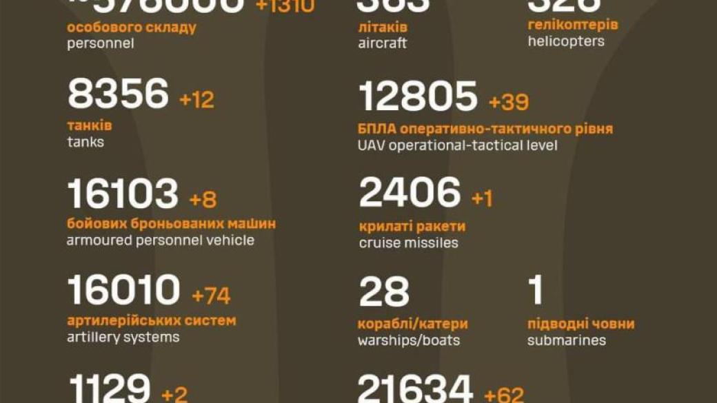 Силы обороны в течение суток ликвидировали 1310 оккупантов и сотни единиц техники.