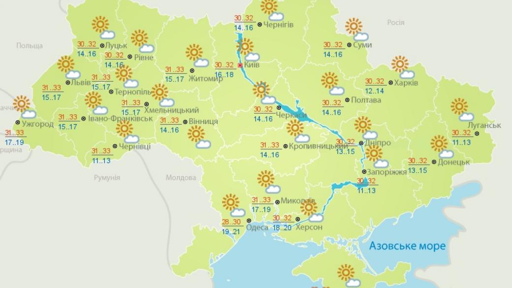 В восточной части страны днем до +32, в центральных и северных — +32 +33 градуса. Киев такая погода тоже не обойдет — днем ожидается до +32 градусов.