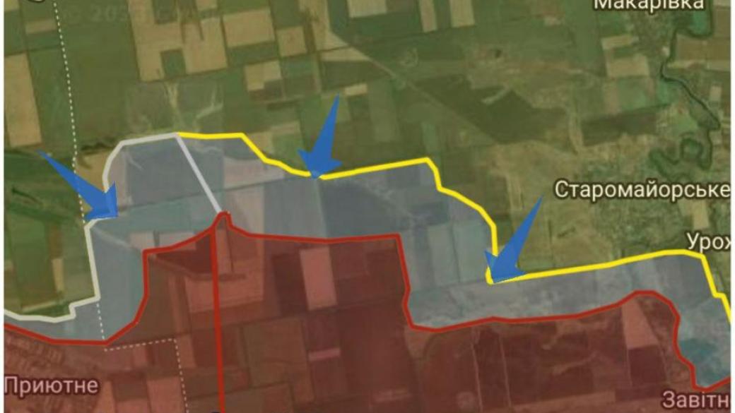 Со стороны ВСУ продолжается зачистка и продвижение в серой зоне. Со стороны противника предпринимаются контратаки и укрепление обороны вдоль участка лесополосы между Приютным и Старомайорским.