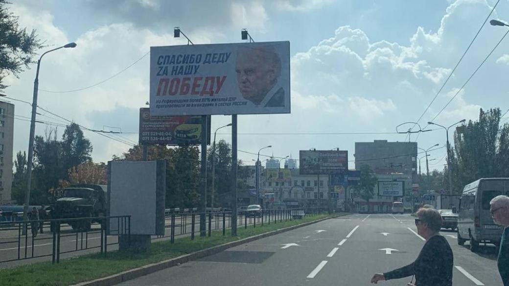 В неподконтрольном Украине Донецке появились борды с "благодарностью" президенту США Джо Байдену за то что, жители «ДНР на «референдуме» поддержали вхождение в состав РФ – «Спасибо деду за нашу победу». Соответствующие фото публикуют подконтрольные ОРДО паблики.