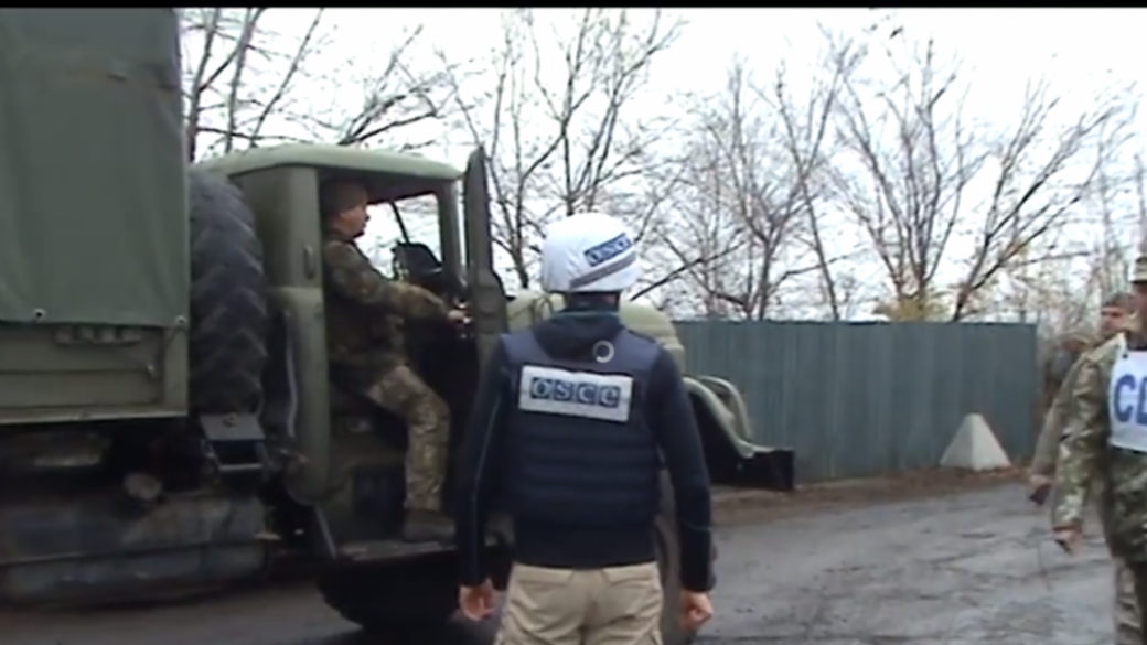 В ролике показано, как украинские военные в присутствии наблюдателей миссии ОБСЕ садятся в машины, а представители миссии переписывают серийные номера личного оружия бойцов.
