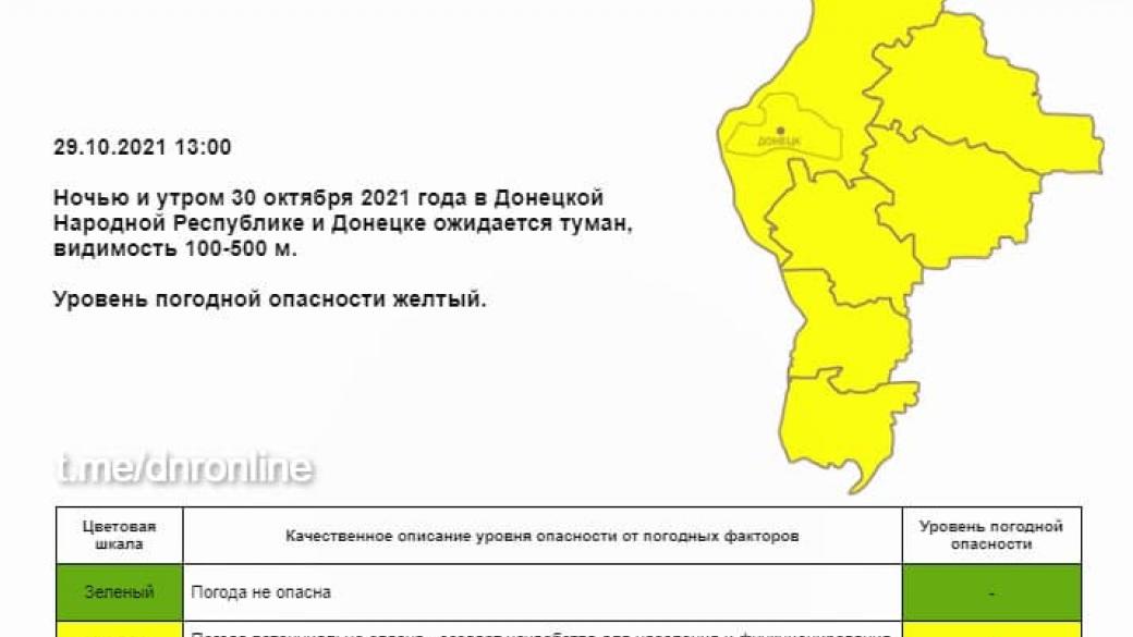 На неподконтрольной Украине территории Донецкой области ночью и утром 30 октября 2021 года ожидается туман, видимость составит 100−500 метров. Об этом сообщает так называемое «МЧС ДНР» со ссылкой на местных синоптиков.