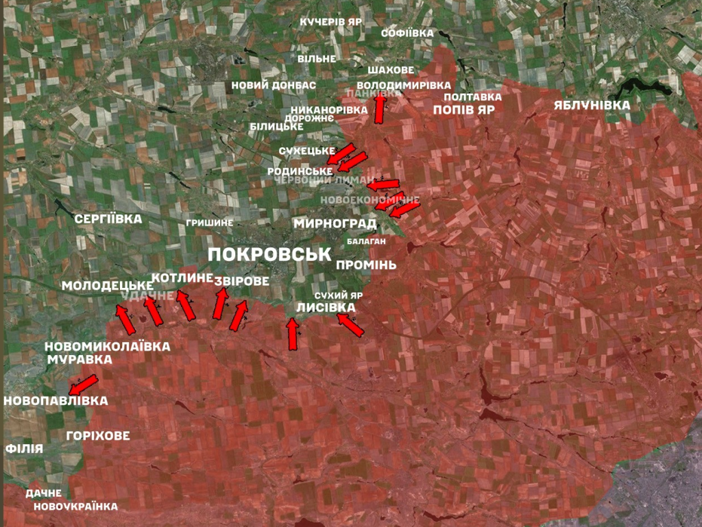 Эксперт отмечает, что есть угроза обхода врагом Покровска с севера: "Наши успехи на Добропольском направлении теоретически могут предотвратить это развитие событий. Но если враг зайдет на Гришино от Родинского, то тогда, очевидно, нам придется из Покровска отступать".