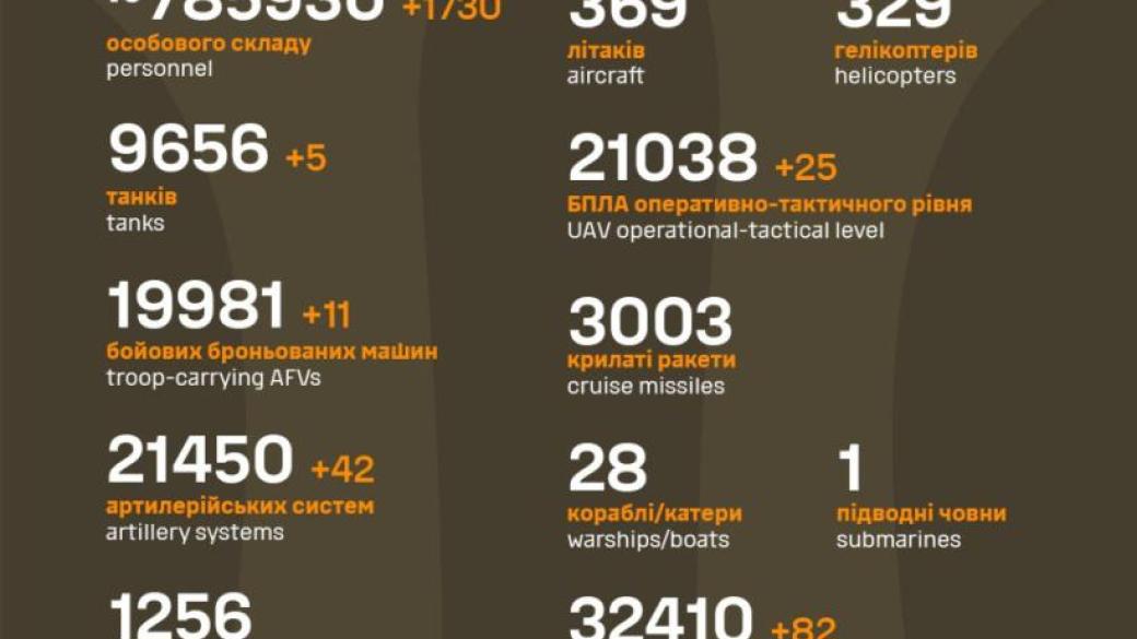 За минувшие сутки ВСУ ликвидировали 1730 оккупантов и уничтожили более 160 единиц техники врага.