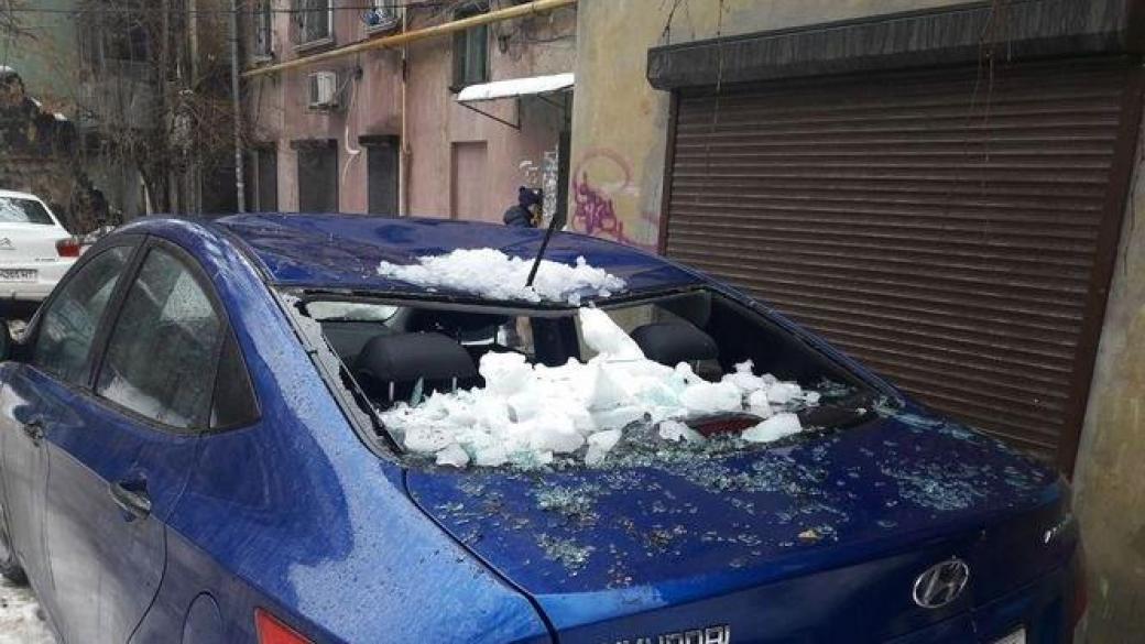 Сегодня в центре Днепра огромный кусок льда упал на припаркованный автомобиль Skoda.