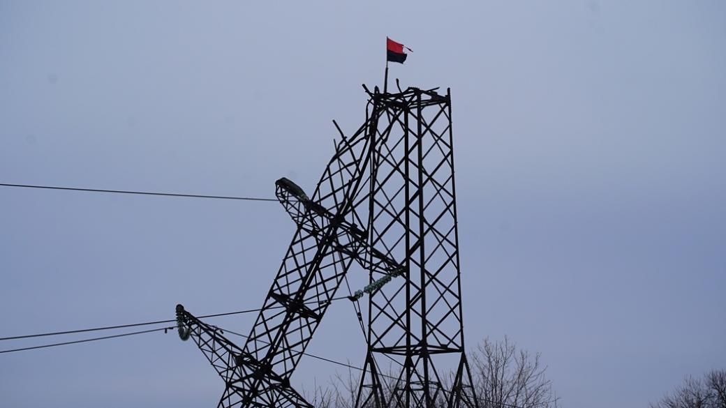 На одной из перебитых высоковольтных вышек украинские бойцы установили красно-черный флаг, чтобы «нервировать» противника: