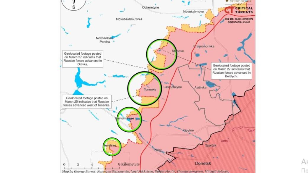 Российская армия имеет незначительные продвижения в Донецкой области возле населенных пунктов вблизи Бахмута и Авдеевки, а также - временно оккупированного Донецка. Об этом сообщили аналитики Института изучения войны.
