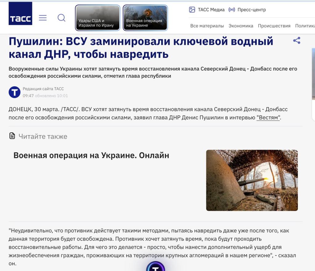 ВСУ хотят затянуть время восстановления канала Северский Донец - Донбасс после его «освобождения» российскими силами. Об этом заявил «главарь днр» Денис Пушилин в интервью "Вестям", сообщало кремлевское агентство ТАСС, на которое ссылается украинский журналист и блогер Денис Казанский.