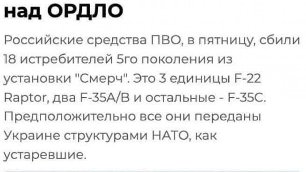 В сообщениях рассказывается, что российское ПВО якобы сбило над «мирным небом» ОРДЛО 18 истребителей НАТО разных модификаций.
