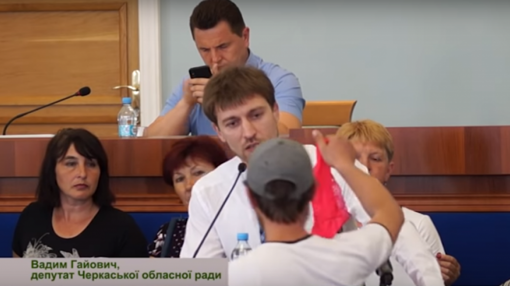 Во время выступления с трибуны депутату Черкасского областного совета Вадиму Гайовичу подарили красные женские трусы. Соответствующее видео появилось на Youtube-канале издания Вичерпно Черкаси.