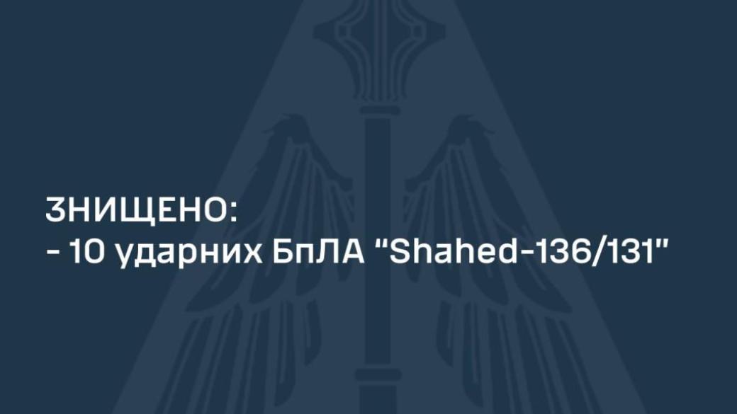 На юге Украины сбиты десять из тринадцати "шахедов", сообщили в Воздушных силах Украины.