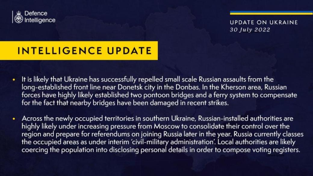 Также в Министерство обороны Великобритании добавили, что в настоящее время Россия классифицирует оккупированные территории как находящиеся под временной "военно-гражданской администрацией". Как предполагают в разведке, оккупационные власти, вероятно, принуждают население раскрывать личные данные для составления списков избирателей.