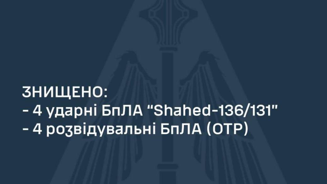 Все беспилотники были уничтожены силами и средствами Воздушных Сил все в пределах Херсонской и Днепропетровской областей, сообщили в СтратКоме ВСУ.