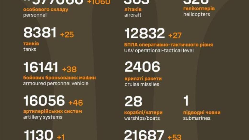 За минувшие сутки ВСУ ликвидировали 1060 захватчиков, 25 танков и более 150 единиц вражеской техники.