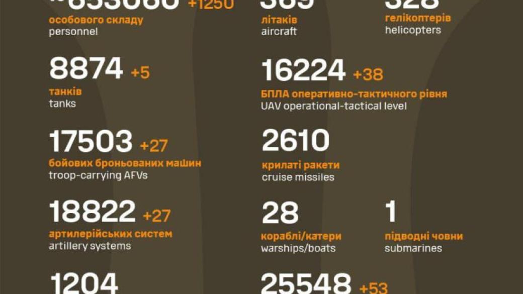 За минувшие сутки украинские защитники и защитницы ликвидировали 1250 российских захватчиков и уничтожили более 160 единиц вражеской техники.