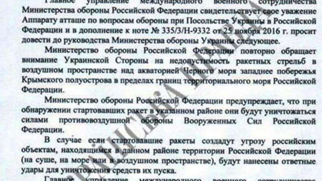 В письме отмечается: «Министерство обороны РФ предупреждает, что при обнаружении стартовавших ракет в указанном районе они будут уничтожаться силами противовоздушной обороны Вооруженных Сил РФ. В случае если стартовавшие ракеты создадут угрозу российским объектам, находящимся в данном районе территории РФ (на суше, на море и в воздушном пространстве), будут нанесены ответные удары для уничтожения средств их пуска».