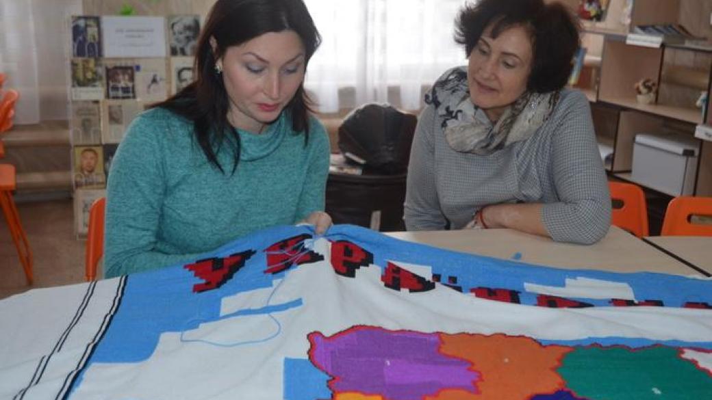 Жительницы Мариуполя присоединились к всеукраинской акции и вышивают крестиком карту Украины размером 3 на 1,5 метра