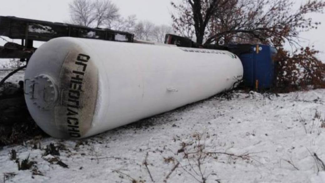 В неподконтрольном украинским властям Краснодонском районе, при попытке избежать столкновения с пассажирским микроавтобусом, перевернулся бензовоз, перевозивший 12 тонн пропана,