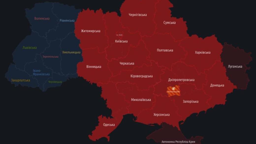 Воздушная тревога объявлена в большинстве областей Украины. В соцсети сообщают о взрывах в Николаевской и Донецкой областях (в районе Константиновки).
