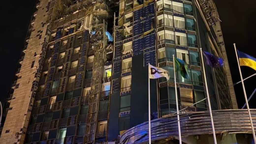 На фото показано, как сейчас выглядит гостиница "Харьков Палас" после попадания российской ракеты.
