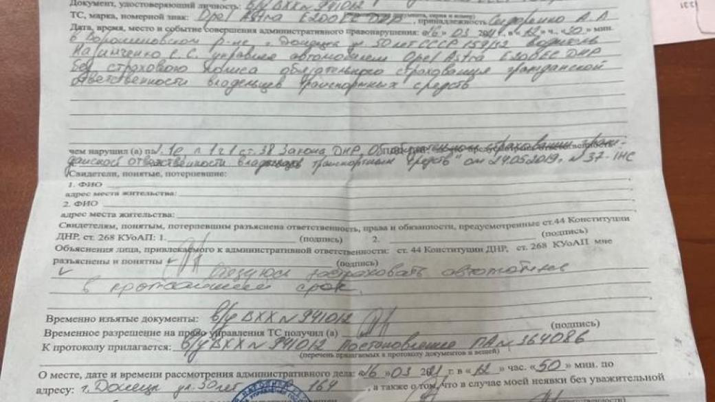 В ОРДО представители местной службы «ГАИ» якобы начали штрафовать водителей транспортных средств за отсутствие полиса ОСАГО. Об этом сообщают подконтрольные ОРДО паблики, которые публикуют фото протоколов, выписанных «правоохранителями».