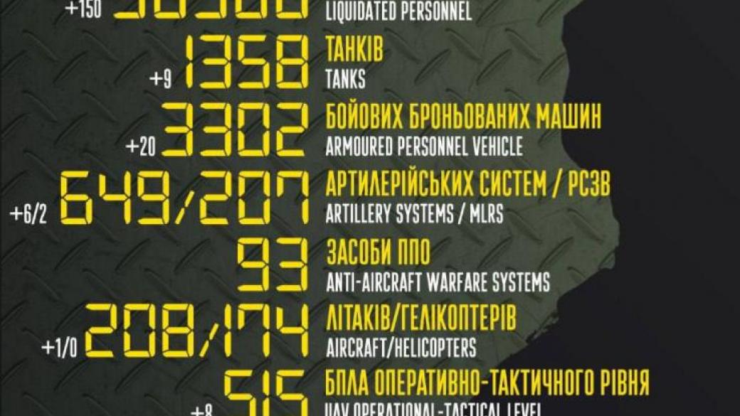 С начала полномасштабного вторжения российских войск в Украину были убиты около 30 500 российских военнослужащих. Об этом сообщает Генштаб ВСУ.