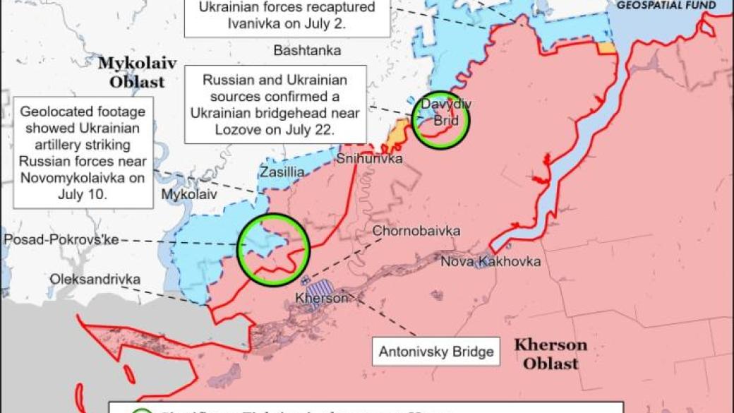"Российские силы также нанесли авиаудары по Новогригорьевке и Андреевке, расположенным вблизи границы Херсонской и Николаевской областей. 30 июля российские войска продолжали обстрел Николаевской и Днепропетровской областей из артиллерийских орудий и реактивной артиллерии. Власти Днепропетровской области сообщили, что российские войска выпустили 40 реактивных систем залпового огня (РСЗО) "Град" по Никополю на западном берегу Днепра. Официальные лица Николаевской области также сообщили, что российские войска нанесли удар по Николаеву из РСЗО "Смерч", - сказано в сообщении.